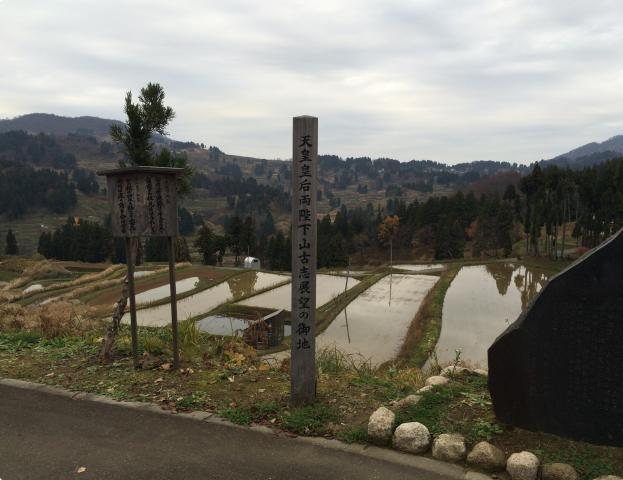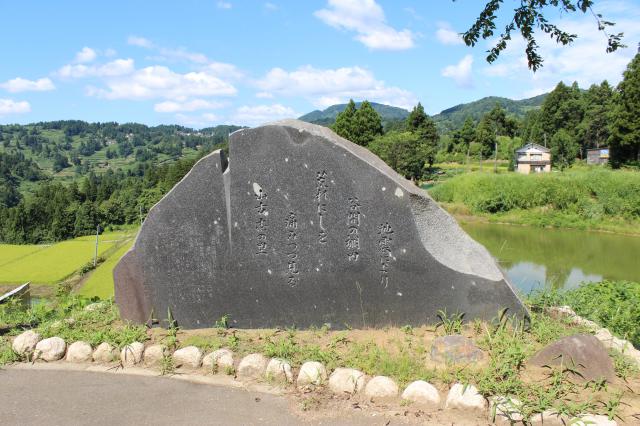 天皇皇后両陛下は新潟県中越地震後の平成16年11月にヘリコプターから山古志地域をご覧になられ、碑にはその際天皇陛下がお詠みになられた御製が刻まれています。碑は平成20年に両陛下が復旧後の風景をご覧になられた場所に建立されています。Their Majesties the Emperor and Empress visited and saw the Yamakoshi area from a helicopter in November 2004, after the Niigata Chuetsu Earthquake, and the monument is inscribed with a poem written by Their Majesties on that occasion. The monument was erected on the same spot where Their Majesties saw the scenery after the restoration in 2008.Sus Majestades el Emperador y la Emperatriz visitaron la zona de Yamakoshi desde un helicóptero en noviembre de 2004 después del Terremoto de Chuetsu, y el monumento está grabado con el poema que hizo el Emperador en ese momento. El monumento fue construido donde los dos emperadores fueron vistos el paisaje restaurado en 2008.天皇陛下和皇后陛下于平成16年(2004年)11月在新泻县中越地震后乘坐直升机视察山古志地区,石碑上刻着当时天皇陛下赋的诗。石碑立在平成20年(2008年)天皇和皇后在复旧后视察的地点。
